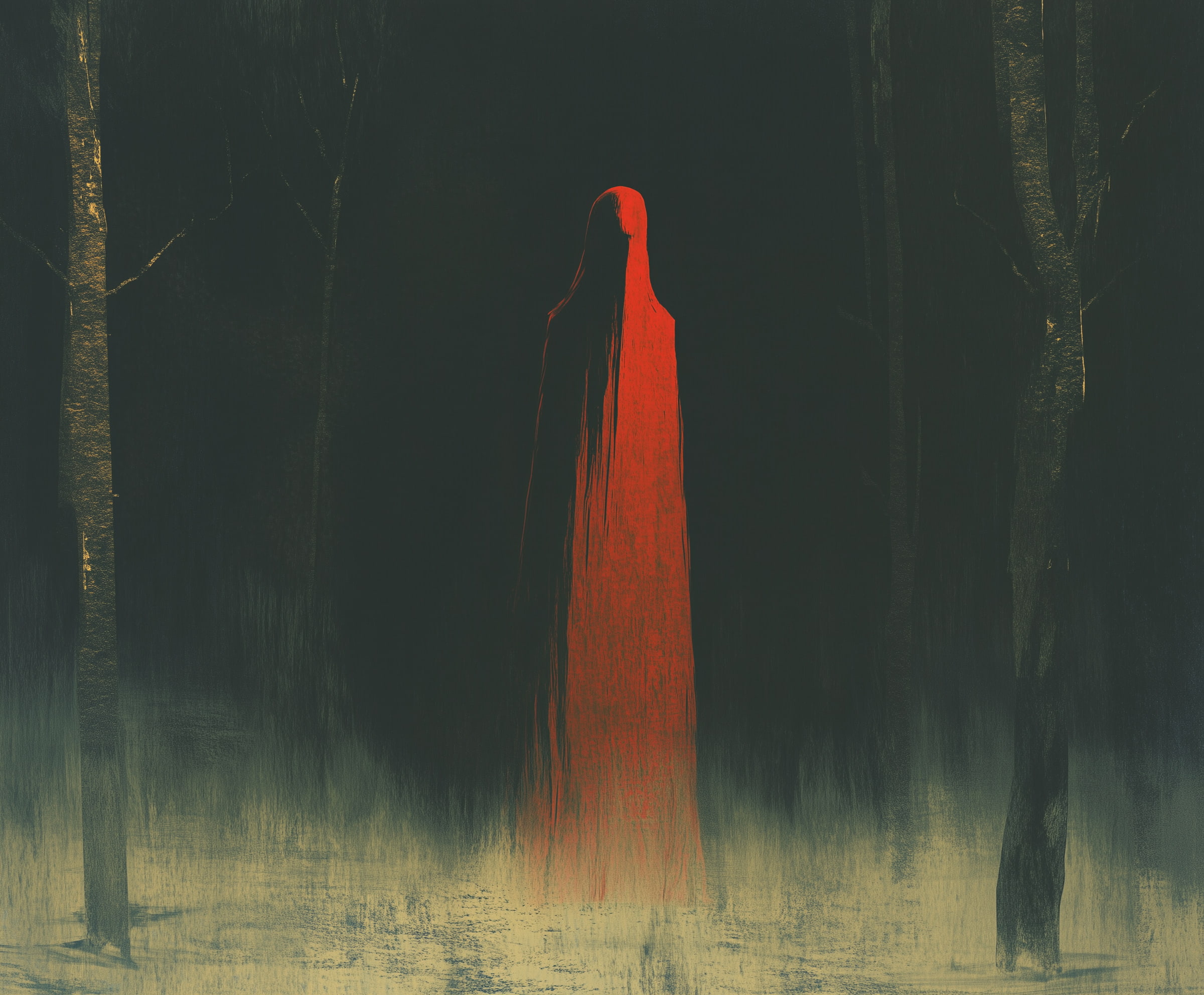It was watching. Not a man, not a beast. Something else. A figure tall as hell, wrapped in deep red, the glint of something sharp where a face should be. My breath went shallow. My body locked up. I thought of running, but before I could, the thing moved – fast as thought, close enough to taste my fear. Cold fingers brushed my throat, my chest, lower still. The whispering grew louder, wrapping around me like a lover’s murmur.